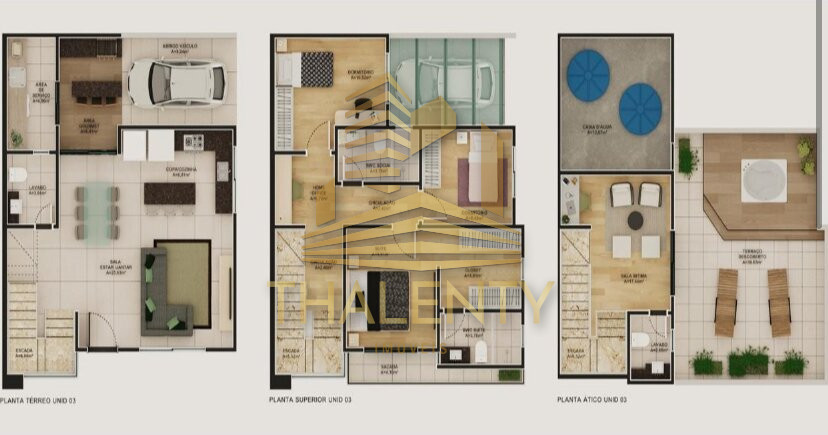 No pavimento térreo, conta com sala para dois ambientes, lavabo, cozinha funcional, área de serviço e garagem para dois veículos, além de um agradável espaço gourmet.